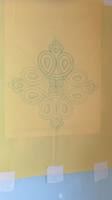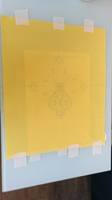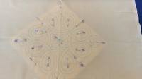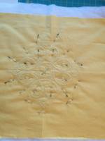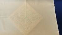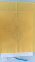 Берем ткань для верха. Складываем её вчетверо, находим центр. Покрутили так и сяк... Как лучше расположить рисунок.Теперь важный момент. Нам надо перенести рисунок на ткань. Для этого фиксируем листочек с рисунком на стекле. Под стекло лампу, на рисунок ткань. Центр должен совпасть с центром рисунка.Вот , что должно получиться. Для переноса рисунка я использую водорастворимый маркер.