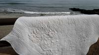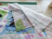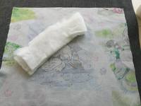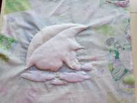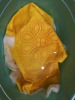 Опускаем нашу заготовку в тёплую воду. Должны уйти следы маркера и водорастворимые нитки. Отжимаем в полотенце, раскладываем сушиться на столе.