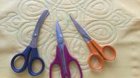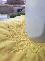 Берём наполнитель... Вот тут надо подумать. Чем толще наполнитель, тем объемнее будет элемент трапунто. Однако надо ещё смотреть на толщину закрытого контура в рисунке. Если он не сильно большой, как у нас, то нужно взять наполнитель потоньше. В любом случае, он должен быть достаточно упругий и не поддаваться горячему утюгу!!!Подкладываем наполнитель вниз, фиксируем булавками.Берём водорастворимые нитки, выставляем , примерно, такие настройки, и акуратно прострачиваем по всем линиям рисункаЕсли нет водорастворимых ниток, то можно использовать обыкновенные, но потом, при второй отстрочке рисунка, надо следить, что бы швы совпали.Острыми ножницами обрезаем весь наполнитель вокруг рисунка. Я использую разные ножницы
