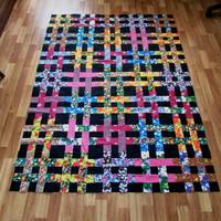 Я тоже готова показать , что у меня получилось. Сначала я разложила блоки попарно. Мне эта раскладка понравилась, но поскольку топ в этом случае был квадратным, а мне нужен был вариант полутораметрового одеяла, раскладку поменяла - разбросала все цвета хаотично. Черной ткани больше нет, кайму не знаю как буду делать.