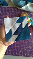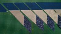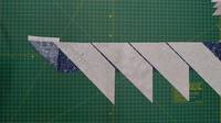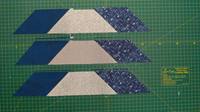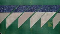 Далее к широким темным полосам пришиваем наши трапеции паровозиком, оставляя 2-3 мм зазора. Прикладываем трапецию острым углом вверх, при этом в начале полосы отступите расстояние, равное ширине самой полосы (для этого просто загните уголок как на фото). Это нужно для того, чтобы потом при разрезании первый ромбик был нужного размера. На одну полосу, выкроенную на всю ширину ткани (108-110 см) у меня влезло 10 трапеций.