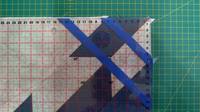 Теперь нужно изготовить шаблон для вырезания трапеций. Для этого к каждой стороне трапеции прибавим припуск и вырежем эту деталь. Наклеим ее с обратной стороны линейки так, чтобы стороны шаблона совпали с краями линейки. Проверьте, чтобы линии начинались и заканчивались на одинаковых значениях с обеих сторон линейки.