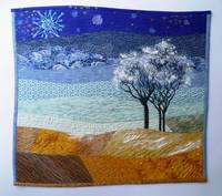 Вовремя не успела попробовать эту технику, решила взять её на экзамен. Вчера еле успела выложить в назначенный срок . Получилось панно 69х64. Хотела изобразить солнечный морозный денек, показать как снег переливается на солнце. Ткани использовала креп-сатин, чтобы лучше блестели .