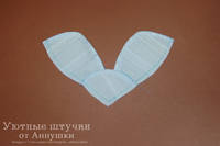4. Теперь складываем ушки так, как показано на фотографии. Обратите внимание, что сложить их надо зеркально. Я складывала как раз на ширину припуска. Оно само так ложится. Чтобы не заморачиваться, что оно развернется, я их прошила по самому краю в согнутом положении.