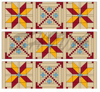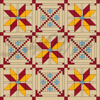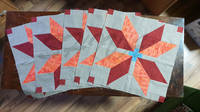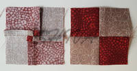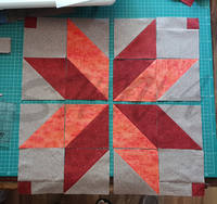 Для звезд у нас используются 3 ткани. Из КАЖДОЙ ткани вырезаем по 4 квадрата размером 10х10 дюймов и по 4 квадрата размером 5х5 дюймов и раскладываем их парами, лицом к лицу. На фото раскладка 10 дюймовых квадратов. Маленькие квадраты раскладываем так же.