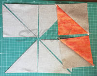 Раскладываем в таком порядке (нужные кусочки из фоновой ткани 16 шт, у нас остались после сшивания детали №5) и сшиваем все.